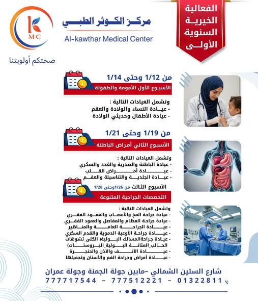 الرئيسية » بلوج » مركز الكوثر الطبي بصنعاء يطلق أسابيع الخير الطبية للعام 2026.. غدا