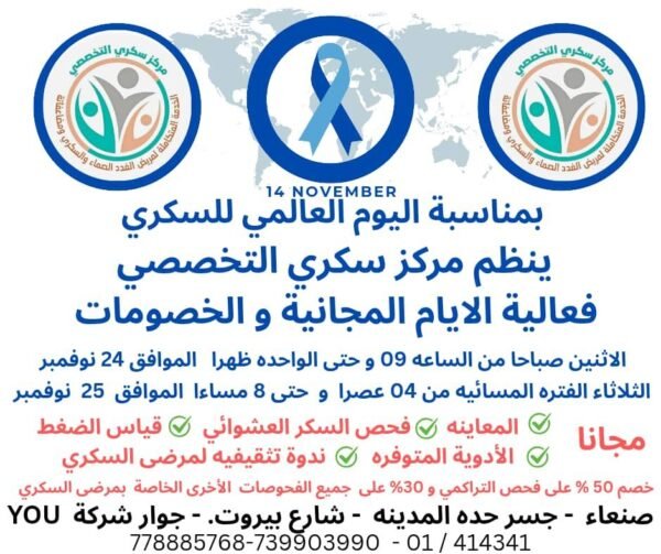 يسر مركز سكري التخصصي دعوتكم لحضور فعالية الأيام المجانية والخصومات ضمن المخيم الطبي الخاص بنا، والذي سيُقام في مقر المركز بصنعاء.