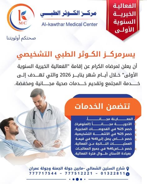 🌿 مركز الكوثر الطبي – صنعاء يطلق غداً الأسبوع الخيري الأول للأمومة والطفولة ضمن الفعالية السنوية الخيرية، والممتدة حتى 14 يناير 2026، في إطار برنامج الأسابيع الطبية الخيرية لعام 2026،والتي…