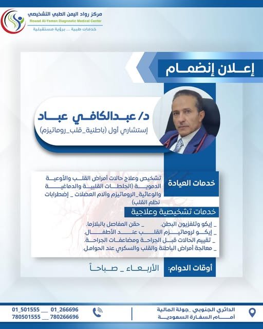استشاري أول (باطنية – قلب – روماتيزم)ضمن التزامنا بتقديم رعاية طبية متخصصة تعتمد على الخبرة والدقة،نضع بين أيديكم خدمات تشخيصية وعلاجية متكاملة وفق أعلى المعايير الطبية.للاستفسار أو حجز موعد، يُرجى…
