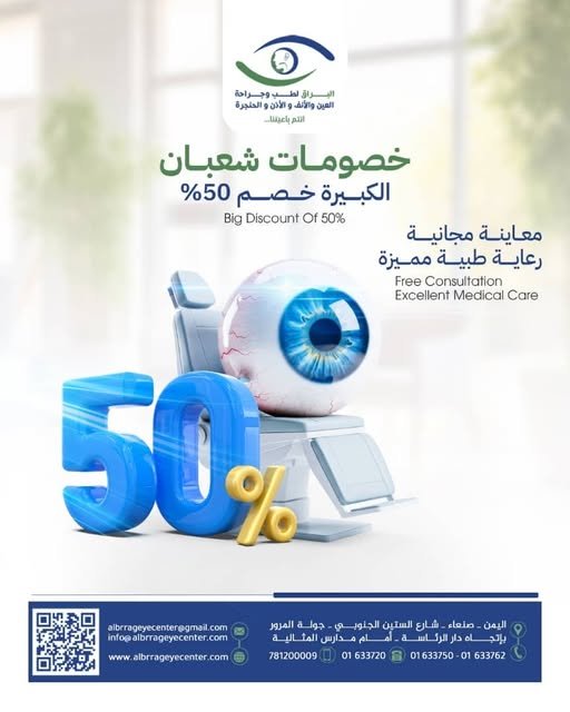 تخفيضات البراق السنوية خلال شهر شعبان … 🌙✔️ معاينة مجانية✔️ خصم 50% على العمليات والأشعة✔️ أفضل الأطباء بخدمتكلا تفوّت الفرصة، صحتك تستحق الأفضلتبدأ التخفيضات من تاريخ 1 شعبان 1447هـ📍 اليمن…