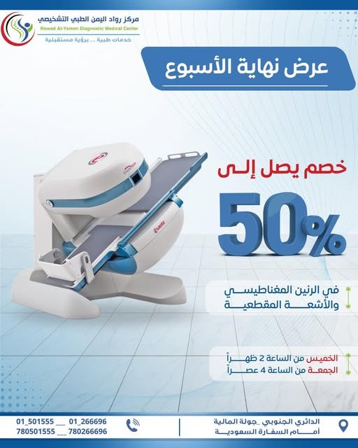 عرض نهاية الأسبوع 🔥خصم يصل إلى 50% على فحوصات الرنين المغناطيسي والأشعة المقطعيةلأن دقة التشخيص تصنع الفرق،نقدم لك فحوصات متقدمة بمعايير عالية وأسعار مدروسة — لفترة محدودة فقط.📍 مركز رواد…