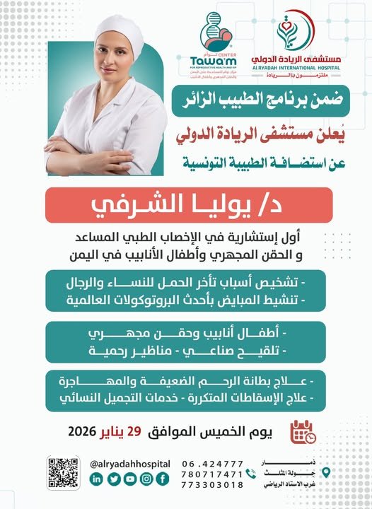 ضمن برنامج الطبيب الزائر 🌿يسرّ مستشفى الريادة الدولي أن يعلن عن استضافة الطبيبة التونسيةد/ يوليا الشرفياستشارية الإخصاب الطبي المساعد والحقن المجهري وأطفال الأنابيب.🔹 خبرة رائدة في تشخيص أسباب تأخر الحمل…
