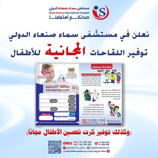 في إطار التزامه الدائم بخدمة المجتمع وتعزيز الصحة العامة، يعلن مستشفى سماء صنعاء الدولي عن إطلاق مبادرة صحية جديدة تتمثل في توفير اللقاحات المجانية للأطفال، إلى جانب تقديم كرت التحصين…
