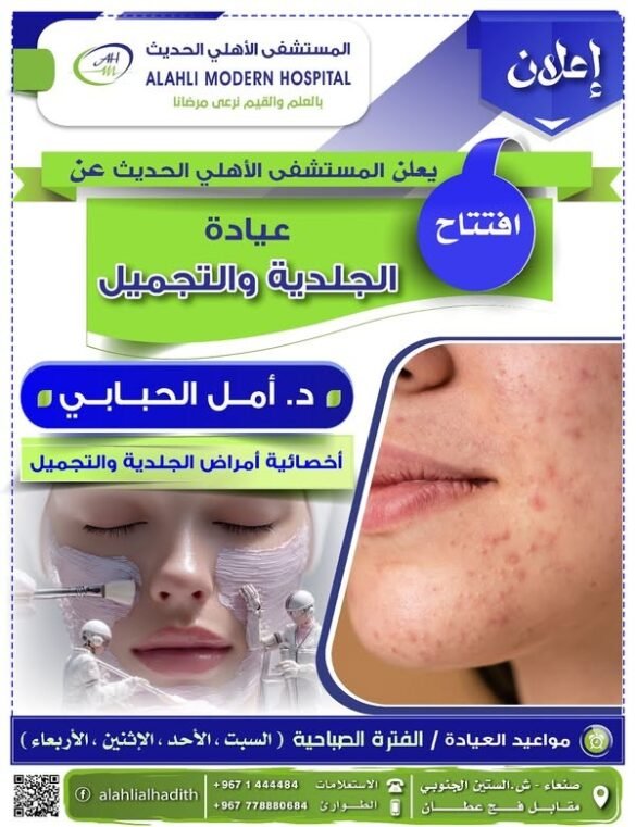 افتتاح عيادة أمراض الجلدية يعلن المستشفى الأهلي الحديث عن افتتــــــاح عيادة:“أمراض الجلدية والتجميــل”إشراف د / أمـــل الحبـــابـي-أخصائية أمراض الجلدية والتجميل-📌 المعالجات التي تجريها :✅ علاج الالتهابات الجلدية بأنواعها..✅ علاج الأكزيما…